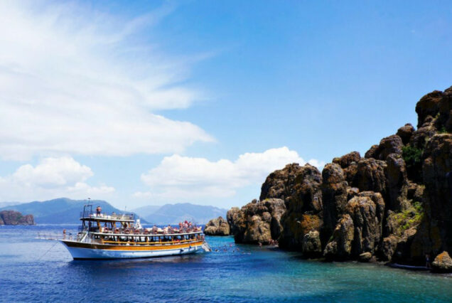 On Marmaris Boat Trip, our tour plan includes a visit to the neighboring islands and bays around Marmaris. The tour includes picking you up from the hotel, all day boat trip, stopping at calm and serene bays. Marmaris Boat Trip provides you an opportunity for snorkeling, swimming, sun bathing, having a lot of fun and an unforgettable day you’ll remember for long. The journey begins with a free transfer from your hotel to the harbor. After which, we begin sailing in the Mediterranean Sea under a clear light-blue sky and an infinite sight of clear water ahead. The route that we follow is; Heaven Island & Fish Farm, Aquarium Bay, and Phosphorous Cave also known as the Wishing Cave, Kumlubuk and Amos, Turunc Village, Green Sea and return back to Marmaris.